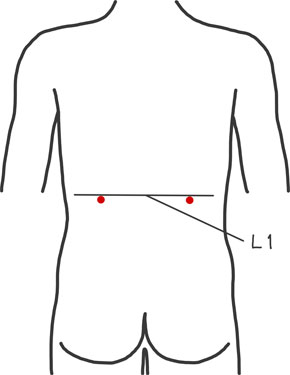 取穴:腰部、第1腰椎棘突起下縁と同じ高さ、後正中線の外方3寸5分