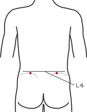 取穴:腰部、第4腰椎棘突起下縁と同じ高さ、後正中線の外方3寸5分