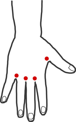 取穴:手背、手を軽く握り、各中手指節関節の間の背側に取る