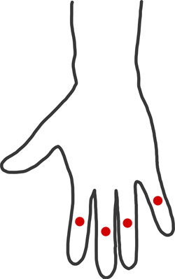取穴:示指・中指・薬指・小指の掌側、近位指節間関節横紋の中央に取る
