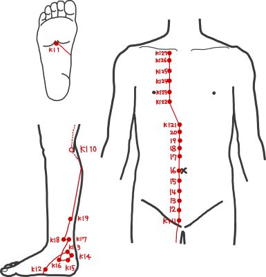 - 水泉(すいせん):足内側、太渓の下方1寸、踵骨隆起前方の陥凹部