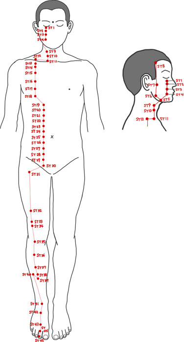 - 滑肉門(かつにくもん):上腹部、臍中央の上方1寸、前正中線の外方2寸